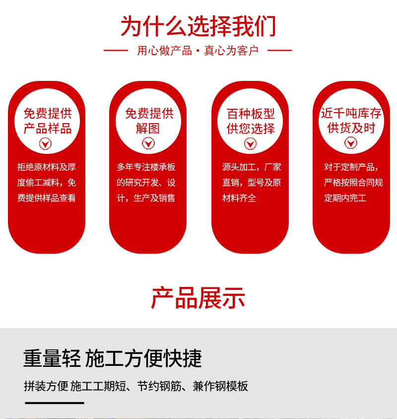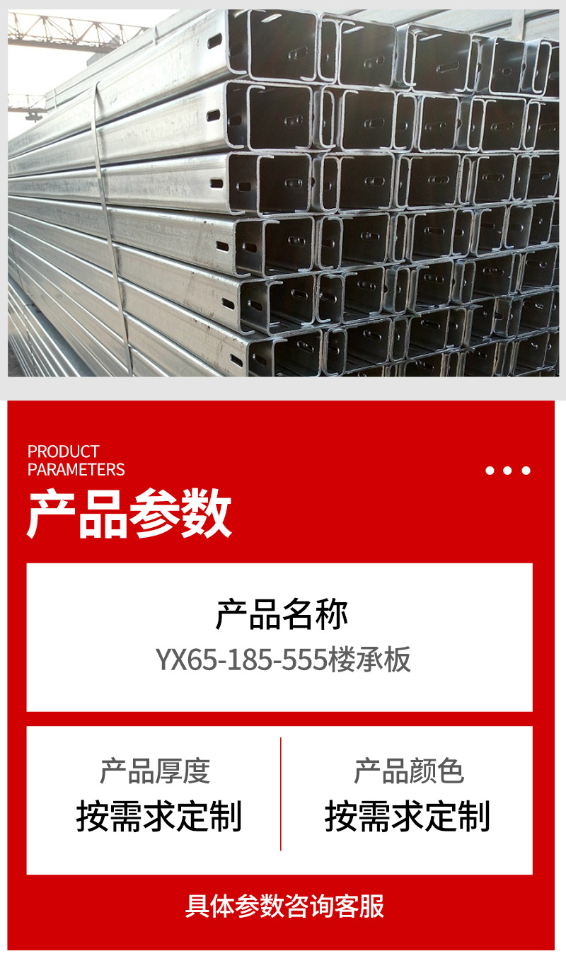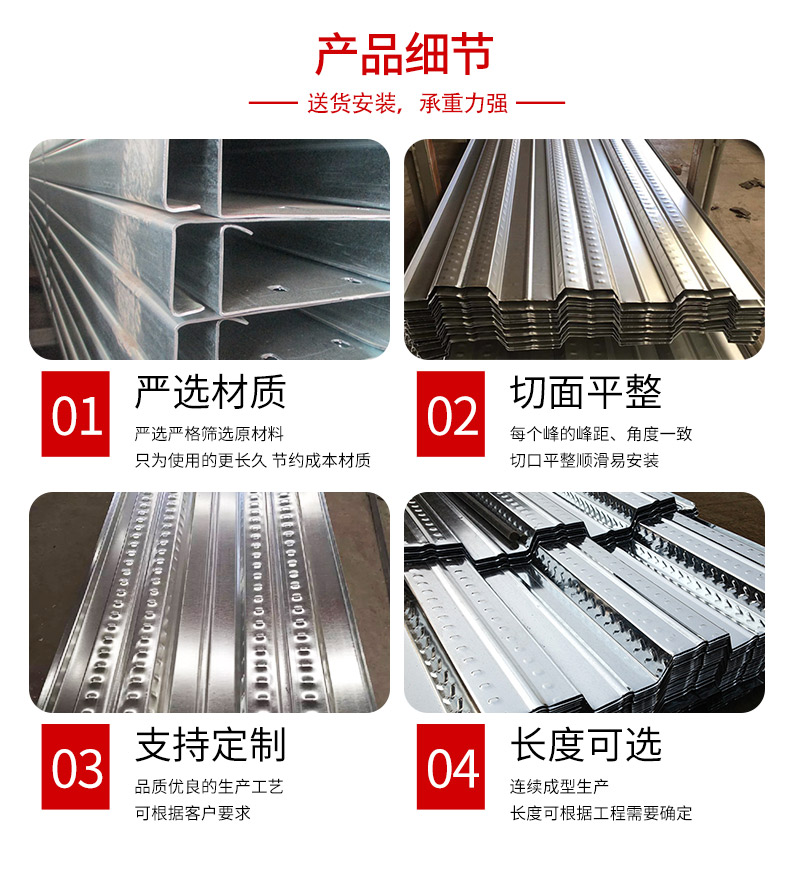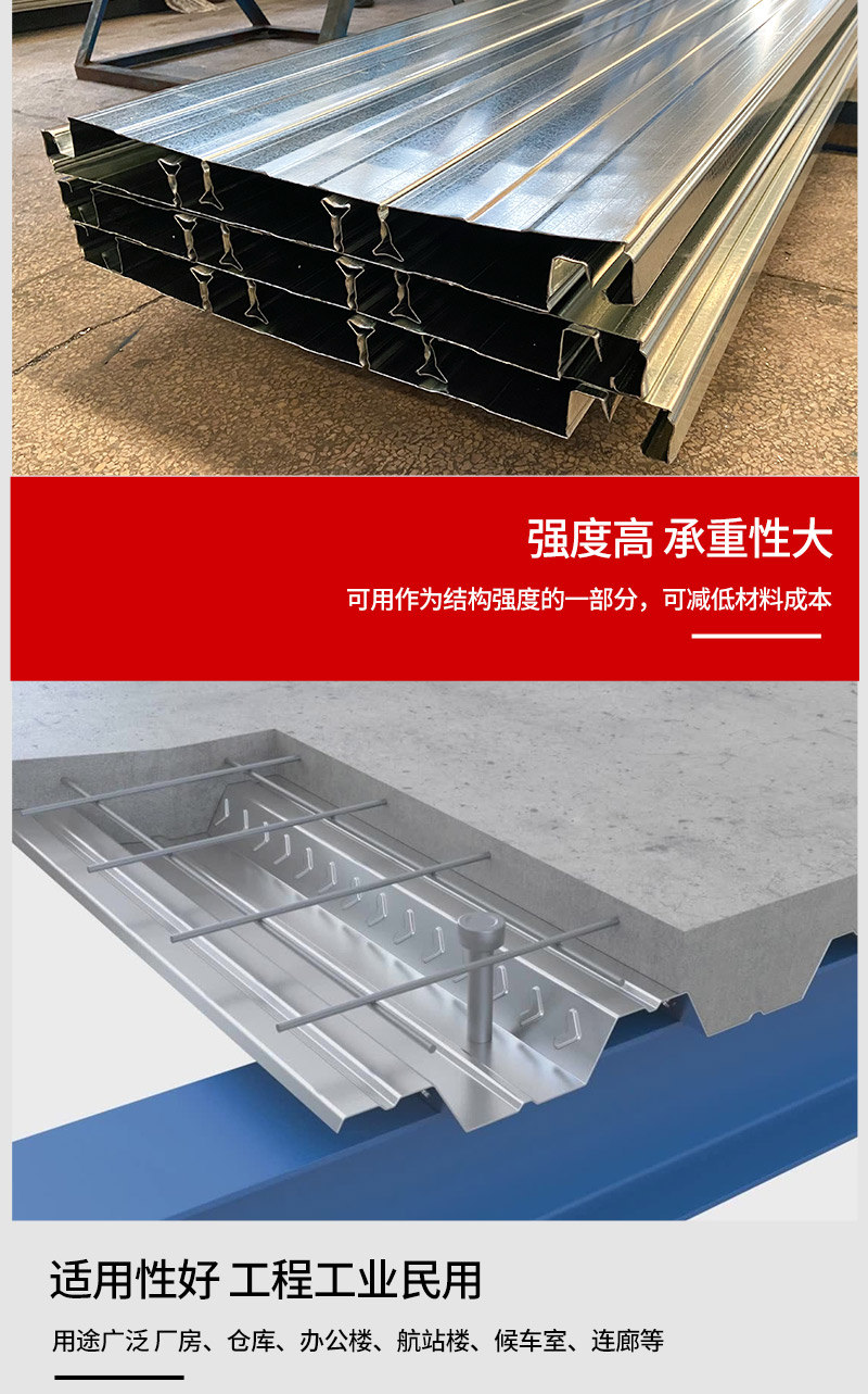 采用鍍鋅鋼板經(jīng)輥壓冷彎制作成型,施工鋪設(shè)后適于澆筑混凝土,與混凝土共同作用聯(lián)合形成一個樓面整體,是建筑鋼結(jié)構(gòu)工程中僅次于梁柱的主體部分,用于樓蓋的永久性支撐模板。