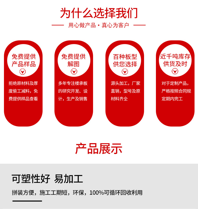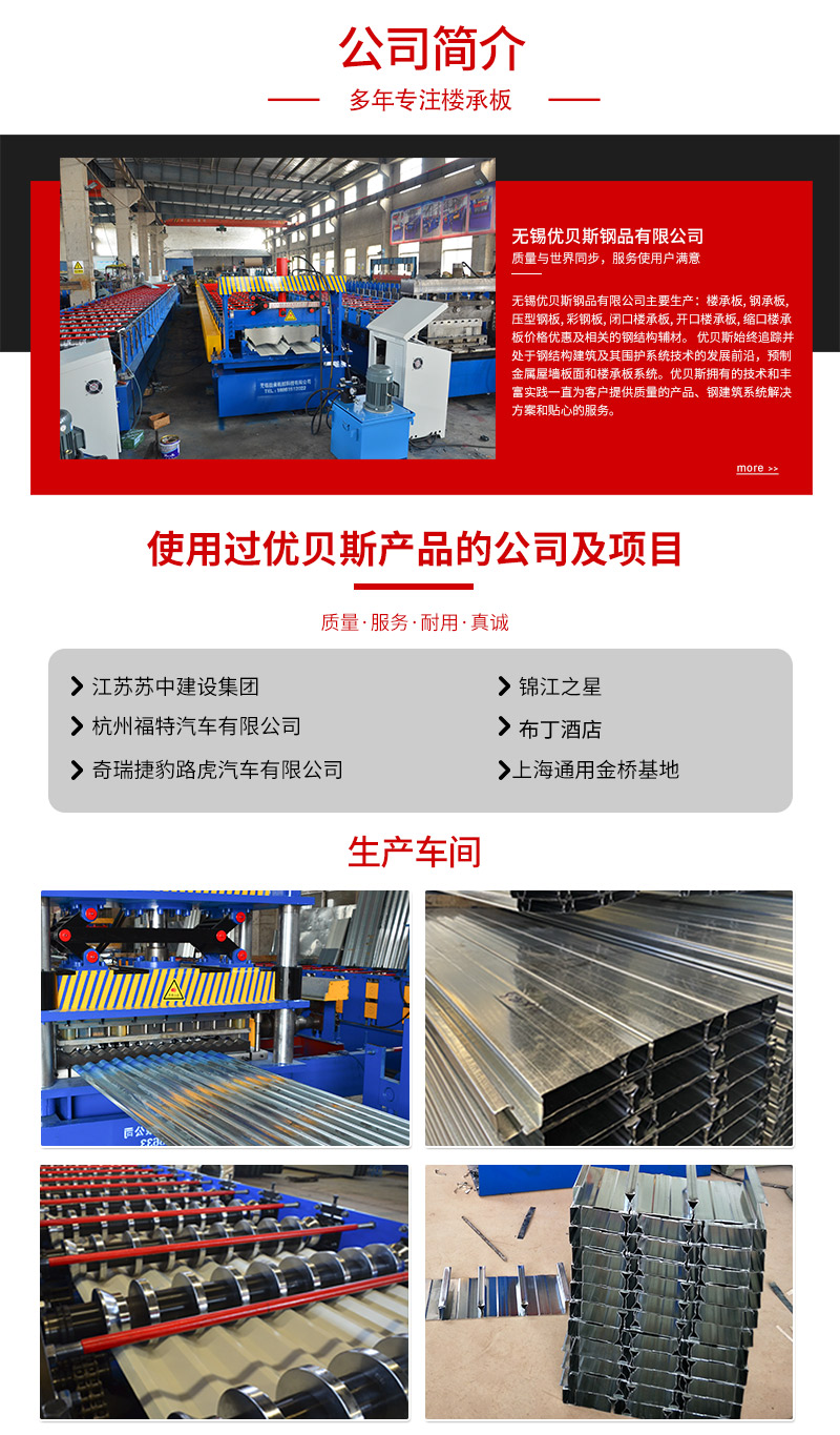 采用鍍鋅鋼板經(jīng)輥壓冷彎制作成型,施工鋪設(shè)后適于澆筑混凝土,與混凝土共同作用聯(lián)合形成一個樓面整體,是建筑鋼結(jié)構(gòu)工程中僅次于梁柱的主體部分,用于樓蓋的永久性支撐模板。